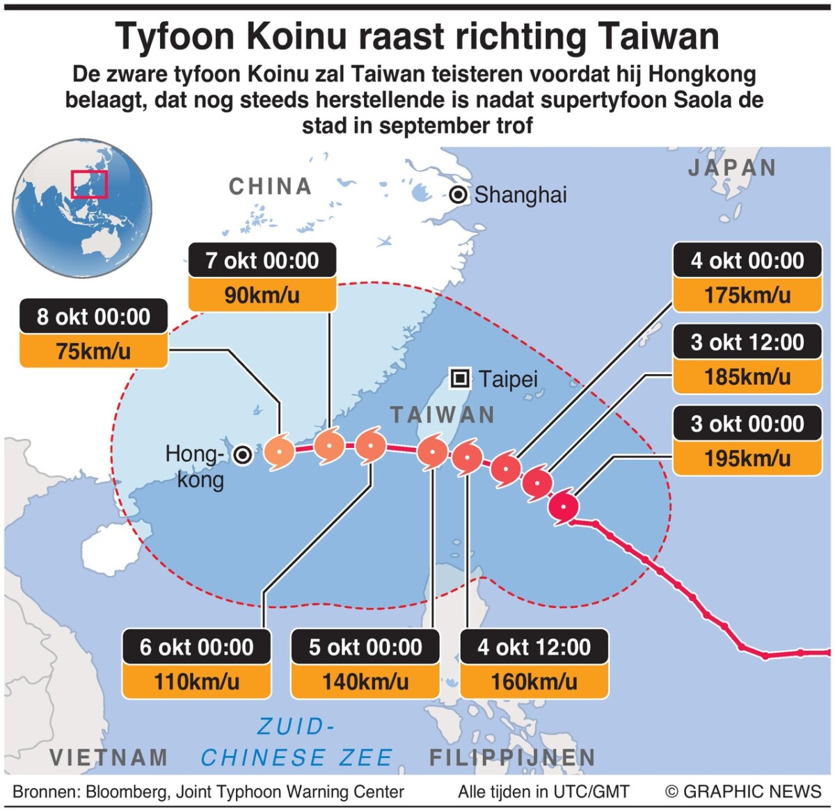 De zware tyfoon Koinu zal donderdag Taiwan teisteren voordat hij Hong Kong nadert, nog steeds herstellende van supertyfoon Saola, die de stad vorige maand trof.