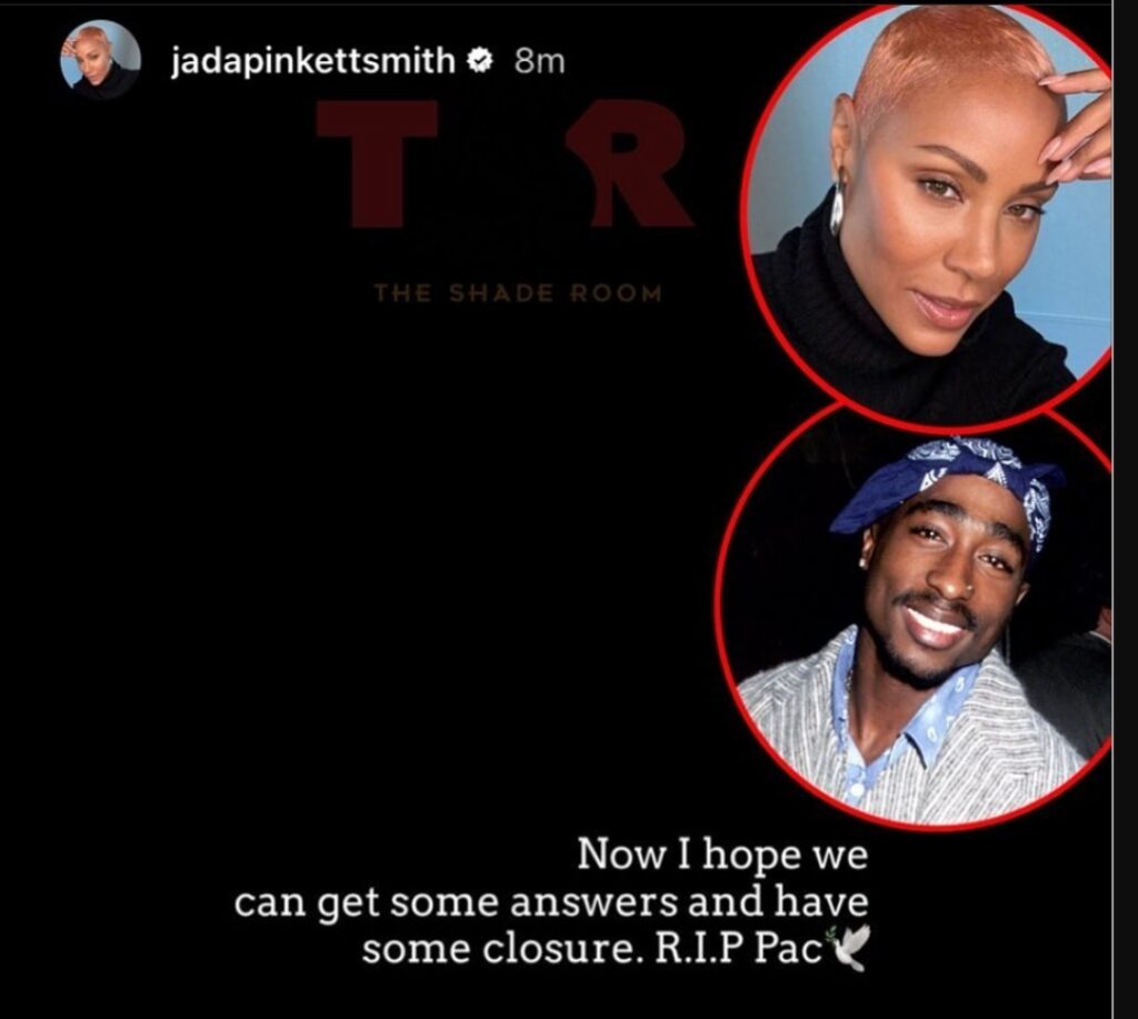 Jada Pinkett Smith heeft haar gedachten geopenbaard over de langverwachte arrestatie van een verdachte van de moord op rapper Tupac Shakur in 1996. Pinkett Smith en Shakur ontmoetten elkaar eind jaren tachtig op de Baltimore âSchool for the Artsâ in Maryland en werden goede vrienden. Nu hoop ik dat we wat antwoorden kunnen krijgen en een afsluiting kunnen hebben. âRUST IN VREDE Pacâ, schreef Pinkett Smith op haar Instagram-verhaal, vergezeld van een witte duif-emoji. Shakur stierf op 7 september 1996 in Las Vegas tijdens een drive-by-schietpartij op 25-jarige leeftijd. Duane âKeffe Dâ Davis werd vrijdag aangeklaagd op beschuldiging van openlijke moord met het gebruik van een dodelijk wapen in combinatie met een bendeverbetering. Hoofdadjunct-officier van justitie Marc DiGiacomo zei dat een grote jury al âenkele maandenâ in de zaak zat. De officier van justitie beschreef Davis als de âcommandant ter plaatseâ die âbevel gaf tot de doodâ van Shakur. Eerder deze maand deelde Pinkett Smith een video waarin zij en Shakur lipsynchroniseerden en dansten op âParents Just Donât Understandâ van Will Smith en DJ Jazzy Jeff. âIk had nooit gedacht dat deze video een tastbare herinnering zou worden, aan de laatste keer dat Pac en ik gewoon kinderen samen warenâ, schreef ze in het bijschrift.