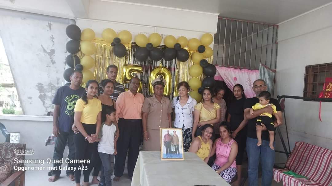 50 gouden jaren trouw samen voor het echtpaar Ramjad – Sewgobind. De heer Tribeniepersad Ramjad is geboren op 5 oktober 1948 in het district Suriname. De school heeft hij doorlopen waarvan hij na de Mulo, de Kweekschool afronde met de richting Hoofdakte. Hierna bezocht hij het IOL en ronde die af met LO akte aardrijkskunde en biologie. Ook behaalde hij M.O. De heer Ramjad bleef niet stil zitten, hij had een passie voor studeren. Hij mocht met goed gevolg de Hindi Letterkunde bachelor en kalligrafie met succes afronden. Vanaf zijn 20 ste jaar starte hij met werken en heeft hij op verschillende scholen zijn krachten gegeven als leerkracht tot zijn pensionering. Met bijkans 40 dienstjaren sloot hij zijn carriere af. Mevrouw Usha Sewgobind, zag het levenslicht op 13 maart 1955 in het district Nickerie. Na haar huwelijk had zij de zorg over de huishouding en de zorg van de kinderen.