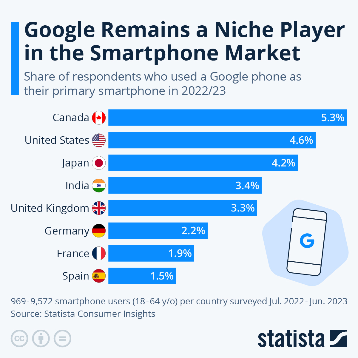 Volgens Statista Consumer Insights blijft Google tot op de dag van vandaag een nichespeler op de smartphonemarkt, waarbij minder dan vijf procent van de smartphonegebruikers in de meeste grote markten een Google-apparaat hun hoofdtelefoon noemt. Zoals uit onze grafiek blijkt, zijn Google-telefoons het populairst in Canada en de VS, waar ze door respectievelijk 5,3 en 4,6 procent van de smartphonegebruikers worden gebruikt. En toch heeft Google volgens schattingen van Canalys in de eerste helft van 2023 slechts 2,6 miljoen smartphones in Noord-Amerika verscheept, terwijl marktleider Apple 35 miljoen iPhones verscheepte.