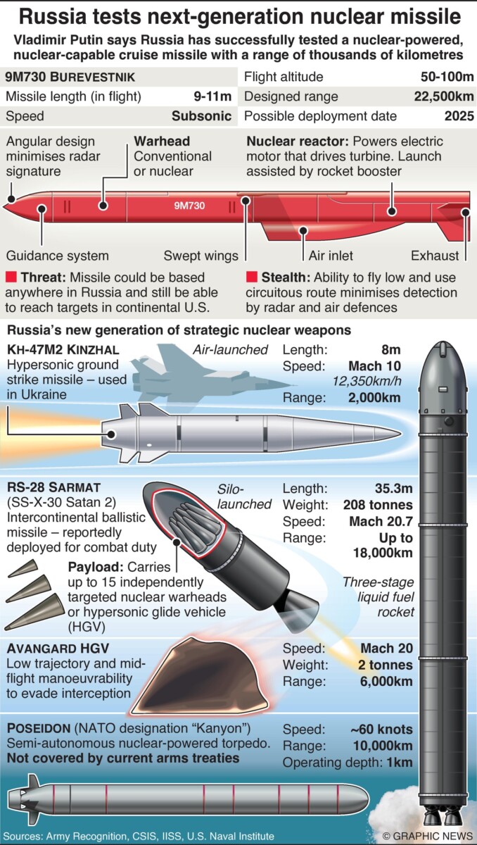 6 oktober 2023 – Vladimir Poetin zegt dat Rusland met succes een nucleair aangedreven en nucleair geschikte kruisraket heeft getest met een bereik van duizenden kilometers.