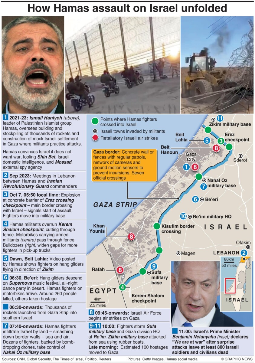9 oktober 2023 – Een drie jaar durende campagne van misleiding zorgde ervoor dat Israël overrompeld werd toen de Palestijnse islamitische groepering Hamas zijn verwoestende aanval lanceerde, waardoor een troepenmacht met bulldozers, deltavliegers en motorfietsen het op kon nemen tegen de machtige Israëlische strijdkrachten (IDF). .
