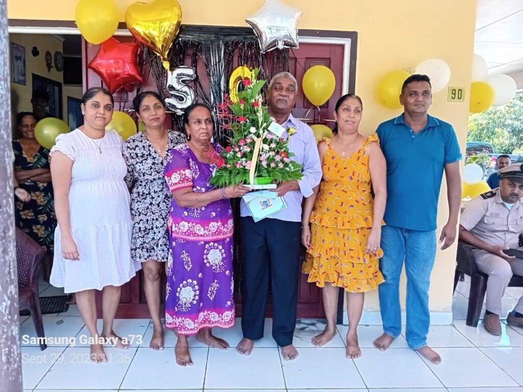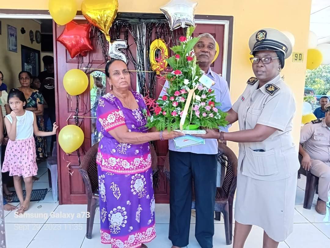 Onlangs vierde het echtpaar Gobind – Jodha te midden van hun kinderen, kleinkinderen en familieleden, een mijlmaal van 50 gouden jaren in het echt verbonden met elkaar. De in Suriname geboren heer Soedhaker Gobind, zag het levenslicht op 1 oktober 1951. In 1976 kreeg hij de gelegenheid bij de Suralco te werken op de afdeling smelterij of te wel Potroom en gaf zodoende zijn krachten aldaar tot aan zijn pensionering. Zoals de meeste mannen is meneer een voetbal liefhebber en voetbalde hij als jongeman voor de vereniging S.V.Boxel. Mevrouw Bisoenday Jodha is geboren op 30 Juni 1954 te Commewijne. Na het huwelijk is zij altijd de motor van het gezin geweest. Als hobby’s heeft mevrouw hengelen en het planten van bloemen. Het gezin werd uitgebreid en werden er 4 kinderen verwekt, waarvan 3 dochters en 1 zoon. Het echtpaar is verder ook rijk aan 9 kleinkinderen. Als huidige activiteiten doet het echtpaar aan het planten van groenten en fruit voor eigen gebruik. Daarnaast is het genieten van hun seniore dagen met hun kleinkinderen ook een ontspanning. Als geloofsovertuiging belijdt het echtpaar het Hindoeïsme. Bij zo een jubileum is het gebruikelijk dat het echtpaar bezoek ontvangt van regeringsvertegenwoordigers. De felicitaties alsook een bloemstuk, een felicitatie kaart en een ingelijste foto werden in ontvangst genomen door het echtpaar. De middelen die gepaard gaan bij zo een mijlpaal worden overgemaakt op een bankrekeningnummer opgegeven door het echtpaar. Het echtpaar voeld zich gezegend en geeft aan dat geduld, verdraagzaamheid en wederzijds respect de basis zijn binnen een huwelijk.