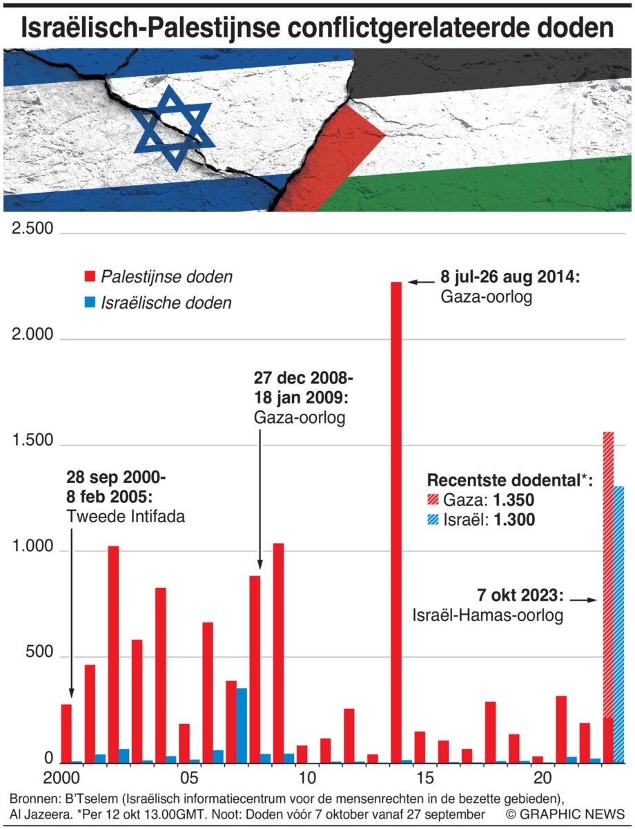 Vanaf 12 oktober om 13.00 uur GMT staat het dodental in Gaza nu op ruim 1.350, terwijl het aantal doden in Israƫl de 1.300 heeft bereikt.