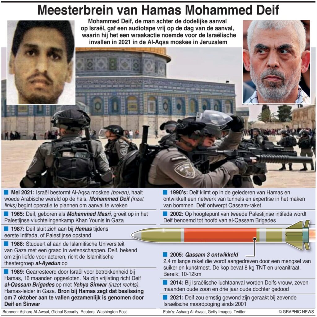 Een man zonder benen, met één arm en één oog, die grotendeels verlamd aan een rolstoel is gekluisterd. Dat is de Hamas-leider die het bevel zou hebben over de aanval op Israël. Het gaat om Mohammed Deif (58), een mysterieuze figuur die al minstens zeven moordpogingen van het Israëlische leger zou hebben overleefd. Deif is de leider van de al-Qassam Brigades, of de militaire tak van Hamas. In die hoedanigheid zaait hij al tientallen jaren dood en verderf in Israël, onder meer door het plannen van zelfmoordaanslagen. Na zijn studies biologie, scheikunde en natuurkunde sloot hij zich in 1987, tijdens de Eerste Palestijnse Opstand, aan bij Hamas. Daar maakte hij snel carrière en raakte hij betrokken bij ontvoeringen en moorden van soldaten op Israëlisch grondgebied. Op televisie is een audioboodschap afgespeeld waarin hij opschept over het afvuren van 5.000 raketten op Israël tijdens operatie ‘al-Aqsa storm’, zoals hij de aanval op Israël noemt. Die operatie is volgens hem een reactie op de al zestien jaar durende blokkade van Gaza.