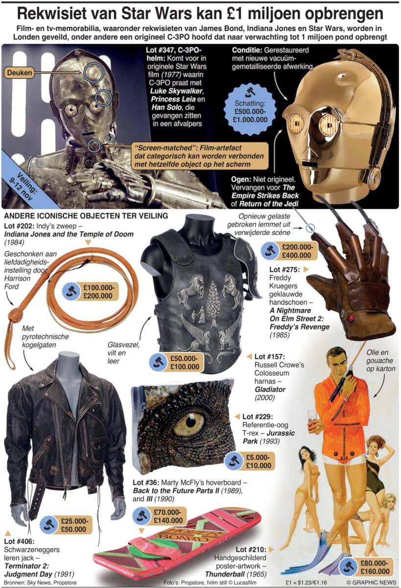 9 november 2023 – 12 november 2023 – Film- en tv-memorabilia, waaronder rekwisieten van James Bond, Indiana Jones en Star Wars, worden geveild in Londen, waarbij een origineel C-3PO-hoofd naar verwachting tot £ 1 miljoen zal opbrengen.