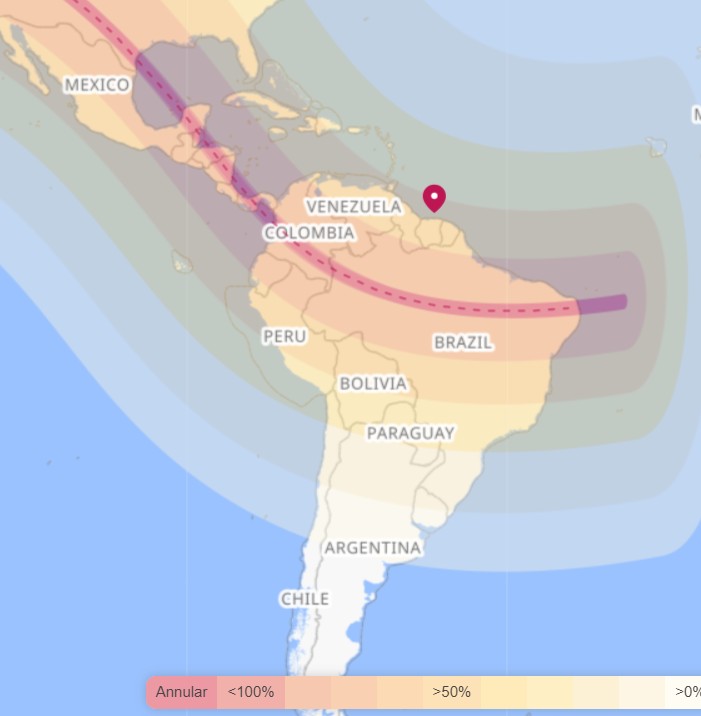 Er zal vanmiddag, zaterdag 14 oktober. een zonsverduistering zichtbaar zijn in Suriname en de regio. Over het westen van de Verenigde Staten, Midden-Amerika, Colombia, Brazilië is de zonsverduistering in volle omvang te zien. Maar, ook Suriname zal deelgenoot zijn van dit astronomisch fenomeen, waarbij overdag het licht van de zon de waarnemer niet bereikt.