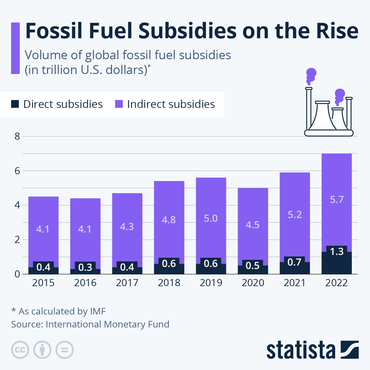Volgens berekeningen van het Internationale Monetaire Fonds (IMF) werd in 2022 zeven biljoen dollar uitgegeven aan directe en indirecte subsidies voor fossiele brandstoffen. De oorlog in Oekraïne en de daaruit voortvloeiende stijging van de energieprijzen zijn deels verantwoordelijk voor de aanzienlijke stijging in de voorgaande jaren. jaar.