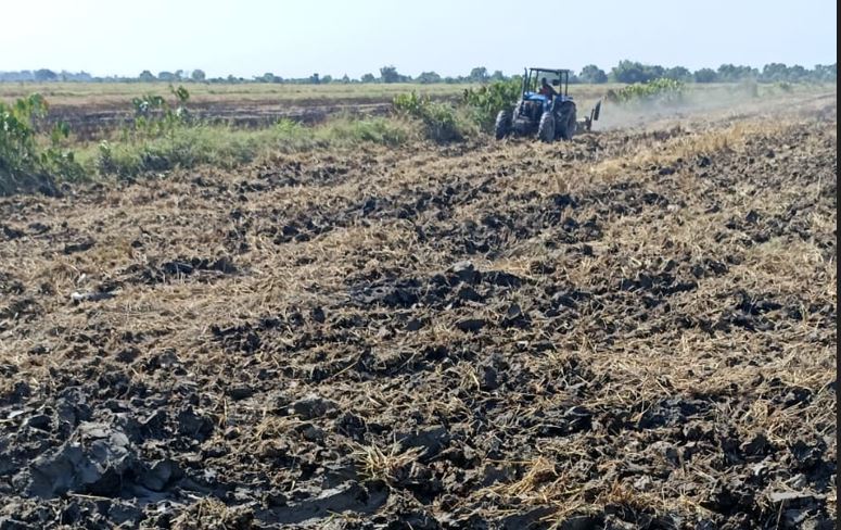 Foto: Op diverse plekken in Nickerie is men reeds begonnen met het omploegen van padiearealen. Het wachten is op de toevoer van water voor de verdere grondbewerking ten behoeve van de inzaai.
