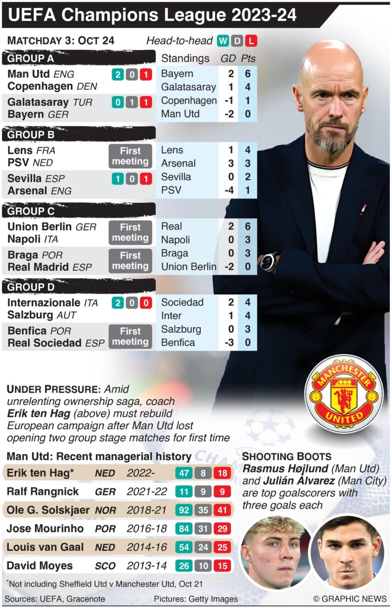 24 oktober 2023 – Europa’s nieuwe UEFA Champions League gaat verder, met belangrijke wedstrijden waaronder Manchester United, na voor het eerst de eerste twee wedstrijden in de groepsfase te hebben verloren, met als doel te herstellen tegen Kopenhagen, Sevilla als gastheer van Arsenal en Real Madrid, met sensatie in vorm Jude Bellingham neemt het op tegen Braga.