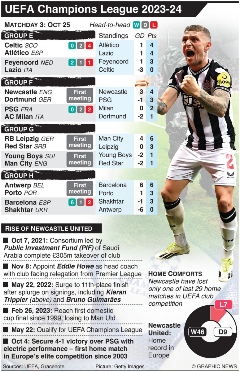 25 oktober 2023 – Europa’s nieuwe UEFA Champions League gaat verder, met belangrijke wedstrijden waaronder Newcastle United, na een elektrisch optreden tegen PSG in hun ruige St James’ Park-stadion, tegenover Borussia Dortmund, Barcelona als gastheer voor Shakhtar Donetsk, en Celtic, op de rand van uitschakeling, tegen Atletico Madrid.