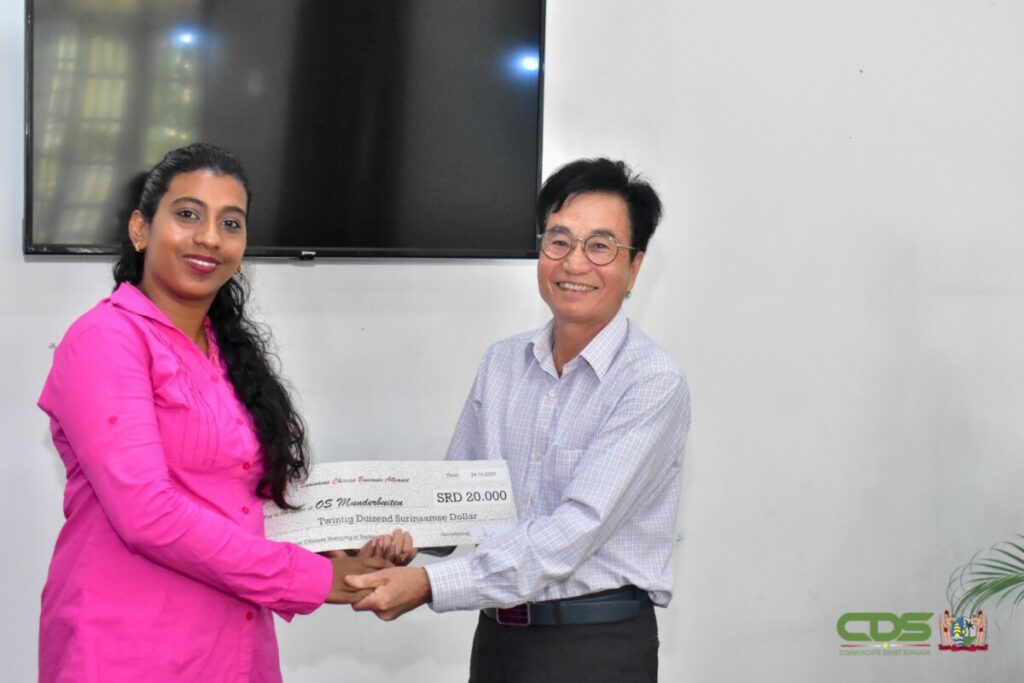 De Suriname Chinese Business Alliance (SCBA) heeft ter viering van 170 jaar Chinese Immigratie, een financiële gift gegeven aan vijf scholen. Elke school heeft een cheque van SRD 20.000 ontvangen. De overdracht vond plaats op 24 oktober 2023 in het Perscentrum van het Kabinet van de President. SCBA-voorzitter Ma Xingrui benadrukte het belang van een goede leeromgeving voor kinderen. De scholen, waaronder OS Munderbuiten, Anton Donicischool, OS Loka Loka, Granman Forsterschool en VO Gakaba, mogen het geld vrij besteden voor hun schoolprojecten. De donatie werd geapprecieerd door de schoolleiders, die van plan zijn het geld te gebruiken voor renovaties en het kopen van kantoorbenodigdheden.
