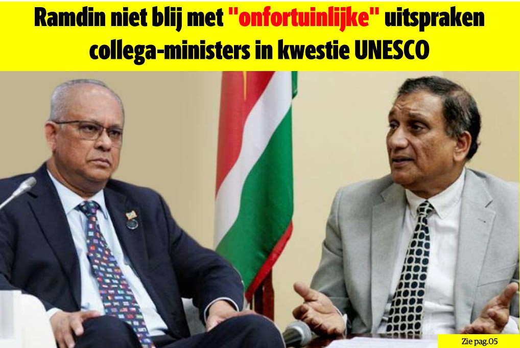 Ramdin werd woensdag voor aanvang van de wekelijks vergadering van de Raad van Ministers geconfronteerd met uitspraken van minister Henry Orie van Onderwijs, Wetenschap en Cultuur over de UNESCO in de kwestie van de bouw van het nieuw vergadercomplex van de Nationale Assemblee. Op een vraag over het gevaar dat de historische binnenstad Paramaribo door de UNESCO van de werelderfgoedlijst wordt geschrapt, reageerde de Cultuur0minister ietwat geïrriteerd met: “Dan wat..!”