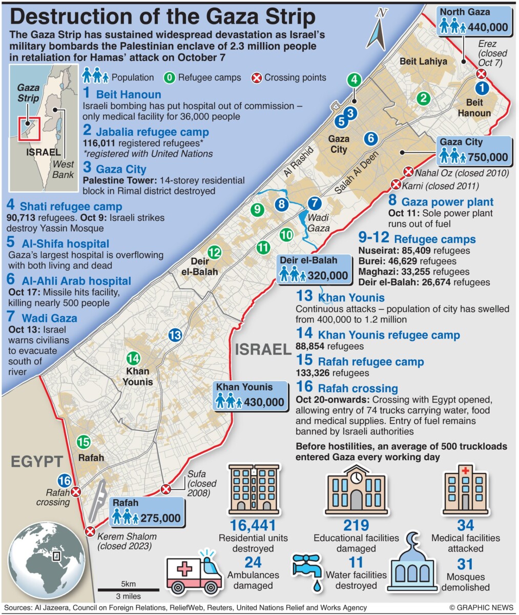 October 27, 2023 – De Gazastrook heeft wijdverspreide verwoestingen opgelopen nu het Israëlische leger de Palestijnse enclave van 2,3 miljoen mensen bombardeert als vergelding voor de aanval van Hamas op 7 oktober.