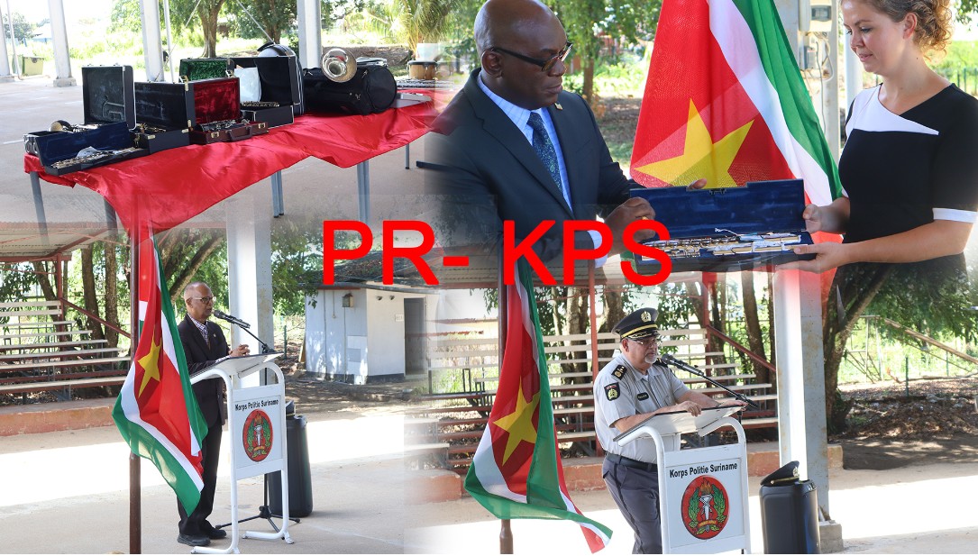 De vertegenwoordigster van de Nederlandse ambassade, Bianca Hettinga, heeft vrijdag 27 oktober op de Politie Academie een grote partij muziekinstrumenten voor de politiekapel overgedragen aan minister van Justitie en Politie Kenneth Amoksi namens het Nederlands Politie Orkest. De minister droeg vervolgens de instrumenten over aan de plaatsvervangend Korpschef, commissaris Stanley Changoer, die op zijn beurt de instrumenten heeft overhandigd aan de kapelmeester, de inspecteur van politie 1e klasse Duncan Marcet.