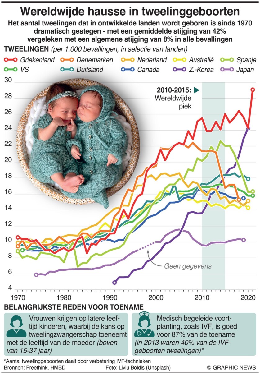 Gegevens uit de Human Multiple Births Database (HMBD), die zo betrouwbaar mogelijke tweelinggeboortecijfers over de hele wereld documenteert, laten zien dat vanaf het midden van de jaren zeventig het aantal tweelinggeboorten in veel landen bijna is verdubbeld – met een piek tussen 2010 en 2015.