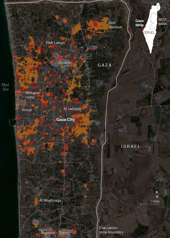 Volgens satellietbeeldanalyse van The New York Times is ten minste 25% van de gebouwen in het noorden van Gaza beschadigd als gevolg van Israëlische luchtaanvallen, waarbij naar schatting 38.200 tot 44.500 gebouwen zijn getroffen.