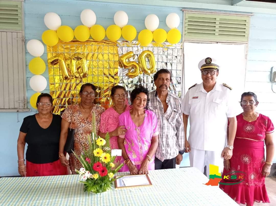 Districtscommissaris Bholanath Narain bracht het echtpaar de felicitaties over namens de regering. Het echtpaar mocht van hem de gebruikelijke gesloten enveloppe met inhoud, een bloemstuk en een fotolijst in ontvangst nemen.