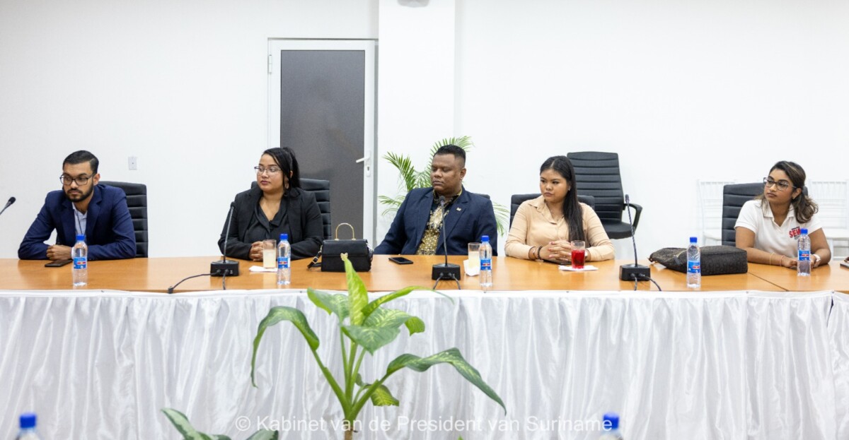 “Jullie zullen een brug moeten gaan vormen naar de studenten en als klankbord dienen wanneer jongeren issues hebben. Daarnaast zullen jullie mij als president moeten adviseren in heel wat zaken aangaande jongeren.” Woorden van president Chandrikapersad Santokhi afgelopen dinsdag 7 november aan leden van het Jeugd Platform op het Kabinet van de President. Voor een betere aansturing van het jongerenbeleid, is dit jongerenteam met twee adviseurs dinsdag op het Kabinet geïnstalleerd.