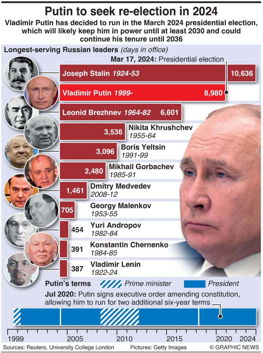 In Rusland heeft de zittende president Vladimir Poetin bekendgemaakt dat hij zich in 2024 opnieuw verkiesbaar stelt. Poetin zou zich bij de verkiezingen van 17 maart 2024 kandidaat kunnen stellen voor een vijfde termijn als president, een stap die mogelijk wordt gemaakt door grondwetswijzigingen die hem in staat stellen tot 2036 in functie te blijven.