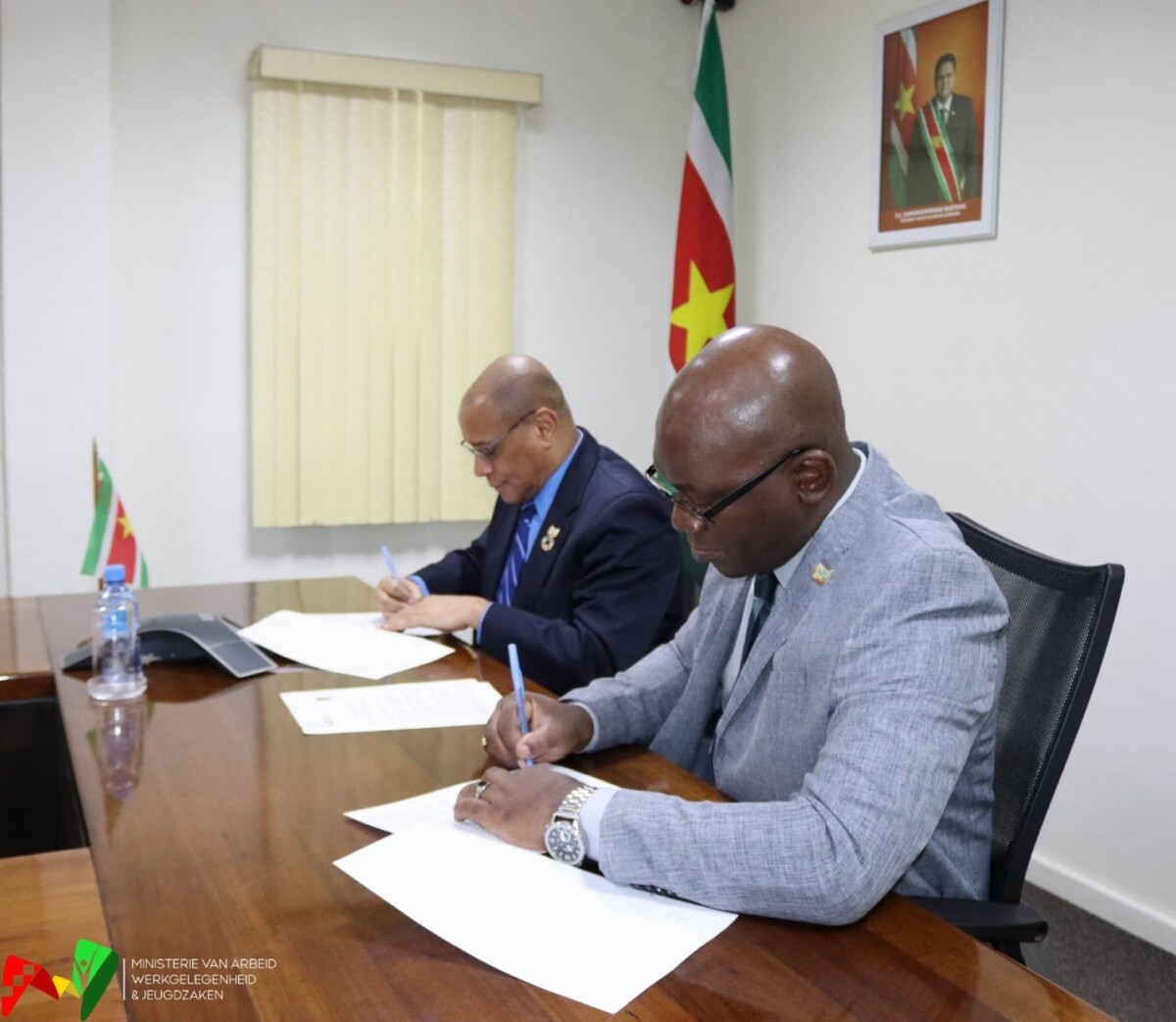 Minister Kenneth Amoksi van Justitie en Politie (JusPol) en minister Steven Mac Andrew van Arbeid, Werkgelegenheid & Jeugdzaken, AW&J, hebben 1 november een Memorandum of Understanding (MoU) ondertekend om door het verzorgen van vakscholing en ondernemerschapstraining gedetineerden handvatten te bieden om na hun detentie aan de slag te kunnen, hetzij als werknemer, hetzij als micro-ondernemer.