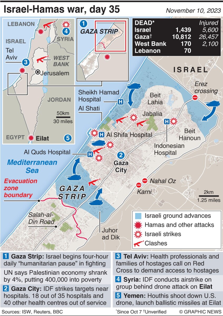 November 10, 2023 – Israël gaat dagelijks vier uur durende “humanitaire pauzes” inlassen om burgers de kans te geven aan de gevechten te ontsnappen en essentiële hulp Gaza binnen te laten, maar de IDF zegt dat er geen staakt-het-vuren is.