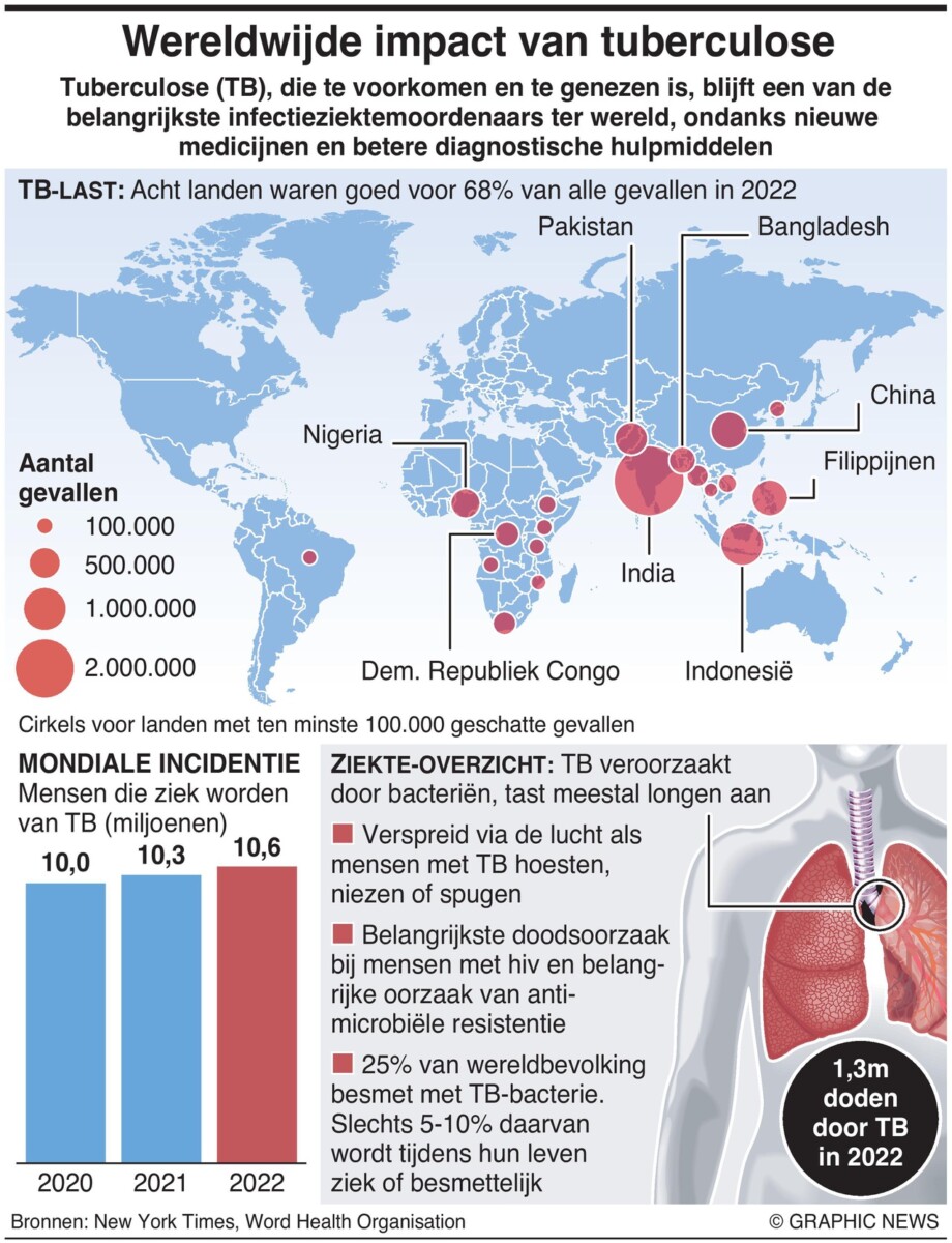 Ook het aantal aan tuberculose gerelateerde sterfgevallen is licht gedaald, van 1,4 miljoen in 2021 naar 1,3 miljoen in 2022. De ziekte blijft vlak achter Covid-19 als de dodelijkste infectieziekte ter wereld, waarbij India, Indonesië en de Filipijnen bijzonder zwaar getroffen zijn door tuberculose, aldus Reuters.