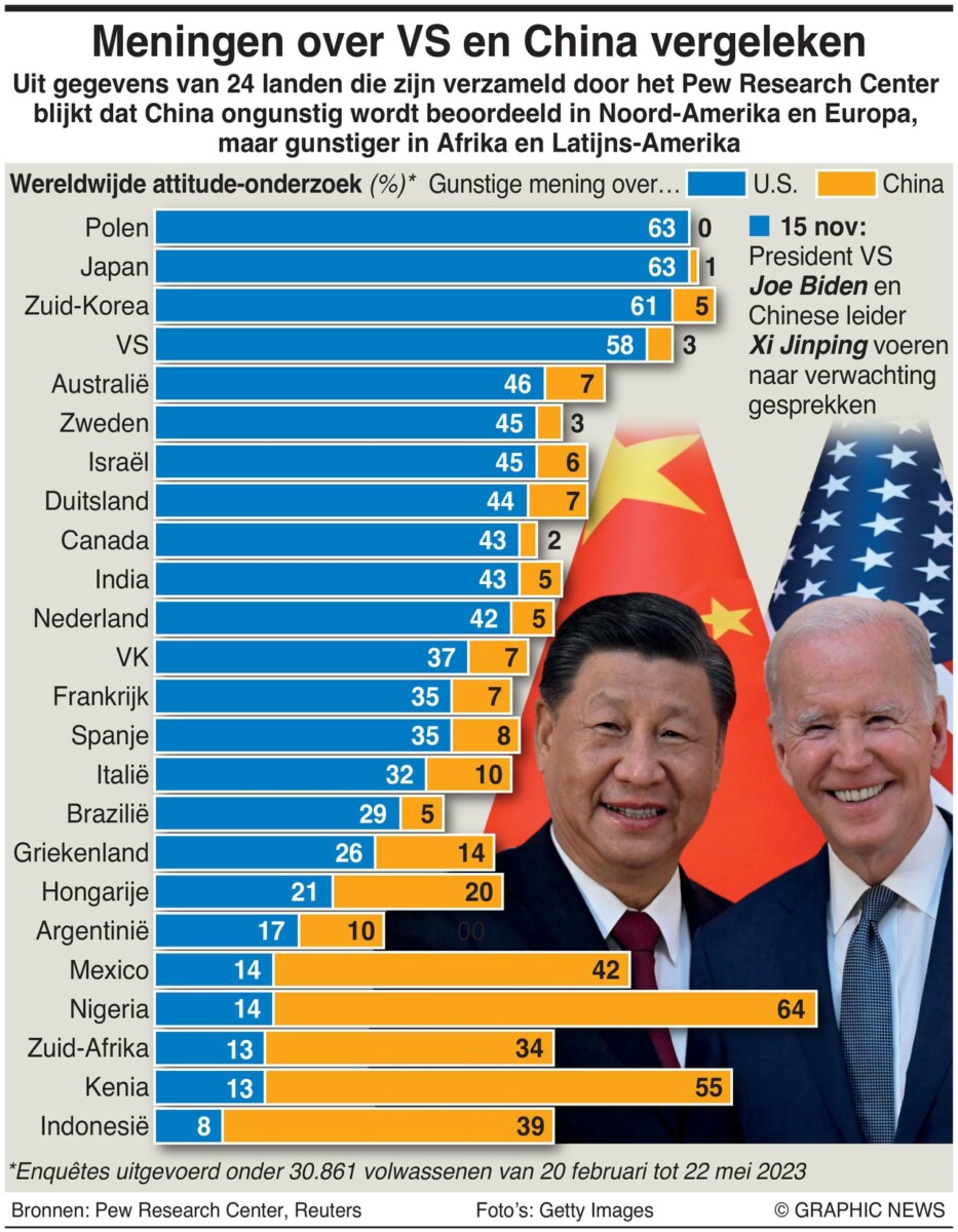 “Een mediaan van 59% geeft positieve evaluaties van de VS, vergeleken met een mediaan van 28% die hetzelfde zegt over China”, zei Pew ook.