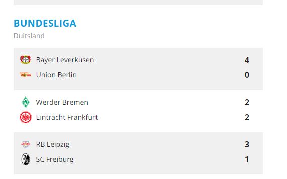Bayer Leverkusen onder leiding van Xabi Alonso heeft een recordstart in de Bundesliga gemaakt met een 4-0 overwinning thuis tegen Union Berlin. Leverkusen behaalde 31 punten uit 11 wedstrijden, wat gelijkaardig is aan Bayern München in 2015/16. Alonso’s team scoorde dankzij Alex Grimaldo, Odilon Kossounou, Jonathan Tah en Nathan Tella. Alonso prees zijn team voor hun prestaties sinds de vorige interlandbreak. Ondanks dat Union-coach Urs Fischer aangaf dat zijn team in een “degradatiestrijd” is, staat Leverkusen nu bovenaan. Union Berlin, dat vorig seizoen nog vierde werd, staat nu onderaan na negen opeenvolgende nederlagen. In andere wedstrijden won RB Leipzig van Freiburg met 3-1, en sprong Borussia Dortmund over naar de vierde plaats. Eintracht Frankfurt speelde gelijk (2-2) tegen Werder Bremen na een achterstand van twee doelpunten.