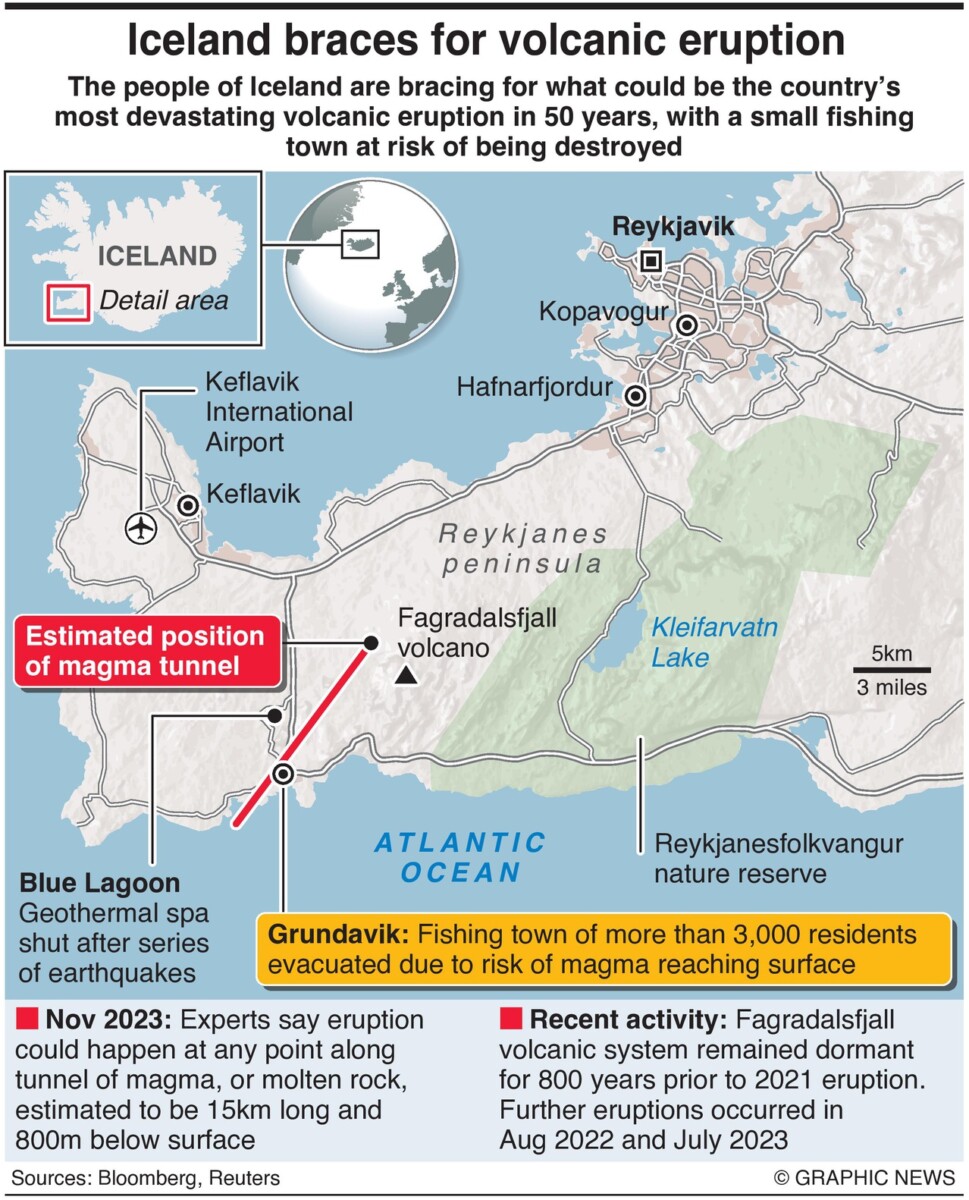 November 13, 2023 – De bevolking van IJsland maakt zich op voor wat de meest verwoestende vulkaanuitbarsting van het land in vijftig jaar zou kunnen zijn, waarbij een klein vissersdorpje het risico loopt te worden vernietigd.