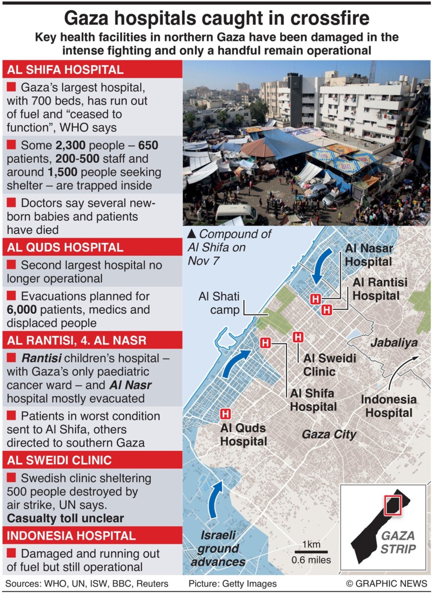 Een ander ziekenhuis in Gaza-stad, Al-Quds, werd gedwongen te sluiten omdat de brandstof op was. De Palestijnse Rode Halve Maan, die de faciliteit exploiteert, zei dat Israëlische troepen in de buurt waren gestationeerd en dat er voorbereidingen werden getroffen om 6.000 patiënten, medici en ontheemden te evacueren.