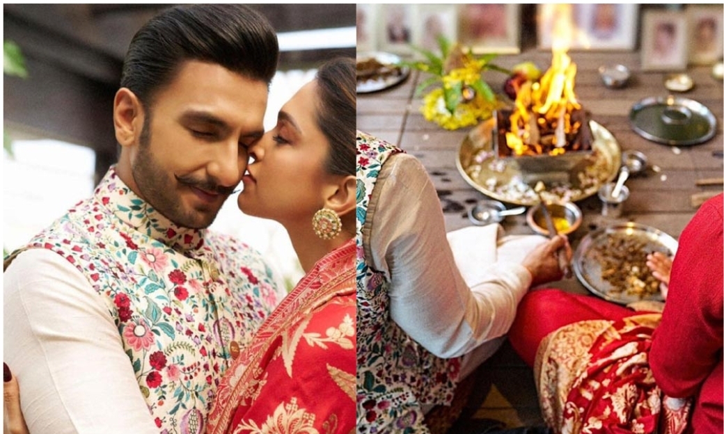 Op foto’s droeg Ranveer Singh een witte kurta met volledige mouwen en een half jasje met print. Deepika droeg een roodgouden jurk.