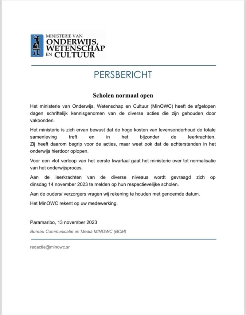 Het ministerie van Onderwijs, Wetenschap en Cultuur (minOWC) had maandag 13 november in een persbericht aangegeven, dat scholen vandaag, dinsdag, normaal open zouden gaan. Het ministerie zei zich ervan bewust te zijn, dat de kosten van levensonderhoud de totale samenleving treft en in het bijzonder de leerkrachten. Maar, dat de achterstanden in het onderwijs hierdoor oplopen.