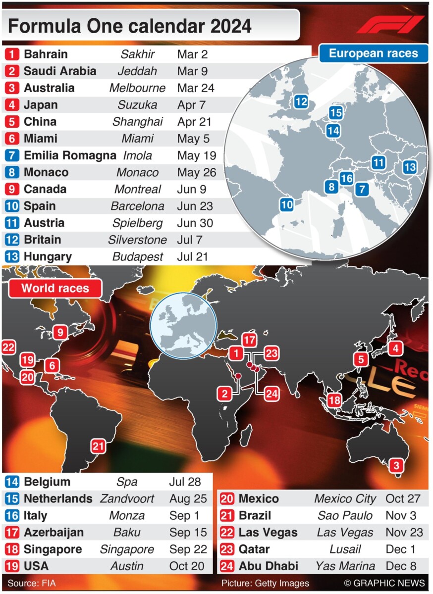 2 maart 2024 – 8 december 2024 – Het 75e Formule 1 Wereldkampioenschap begint met de Grand Prix van Bahrein en eindigt in december in Abu Dhabi