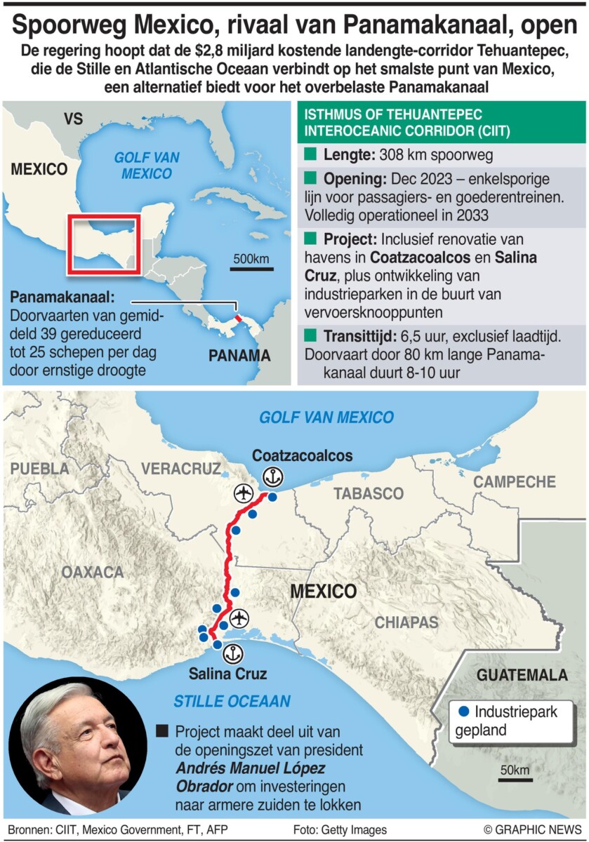 17 november 2023 – De Mexicaanse landengtecorridor Tehuantepec, een spoorlijn tussen de Golf van Mexico en de Stille Oceaan, wordt geopend. Het project ter waarde van 2,8 miljard dollar heeft tot doel een alternatief te bieden voor het verstopte Panamakanaal.