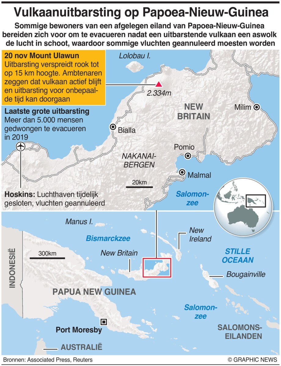 21 november 2023 – Sommige bewoners van een afgelegen eiland in Papoea-Nieuw-Guinea bereiden zich voor op een evacuatie uit de buurt van een uitbarstende vulkaan die een aswolk de lucht in schoot, waardoor vluchten moesten worden geannuleerd.