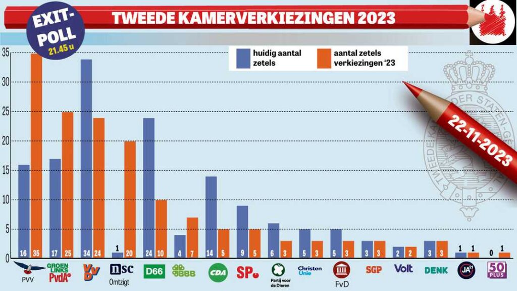 Pieter Omtzigt lijkt als nieuwkomer met zijn NSC op 20 zetels af te stevenen. Hij stond in de peilingen lange tijd aan kop, maar dat veranderde afgelopen week. De PVV van Wilders zat de laatste week juist in de lift. Dat kwam onder andere door de houding van VVD-leider Dilan Yesilgöz. Zij zette aan het begin van de campagne de deur naar de PVV open. Mart Rutte sloot de partij van Geert Wilders bij de vorige verkiezingen uit als mogelijke coalitiepartner.