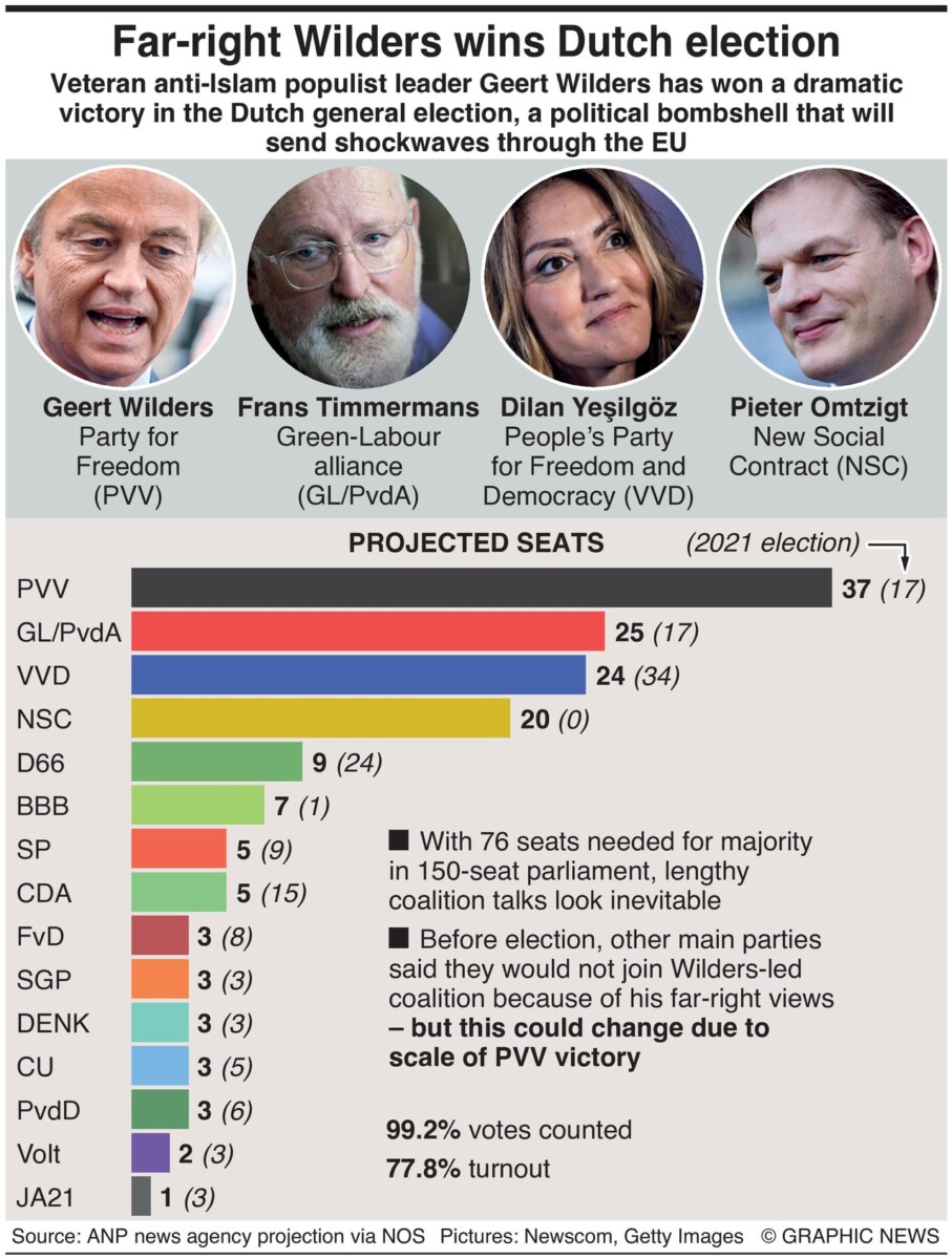 De partij van Wilders werd gevolgd door een linkse alliantie onder leiding van de voormalige EU-klimaatchef Frans Timmermans met 25 zetels, en vervolgens de liberale VVD met 24 zetels.