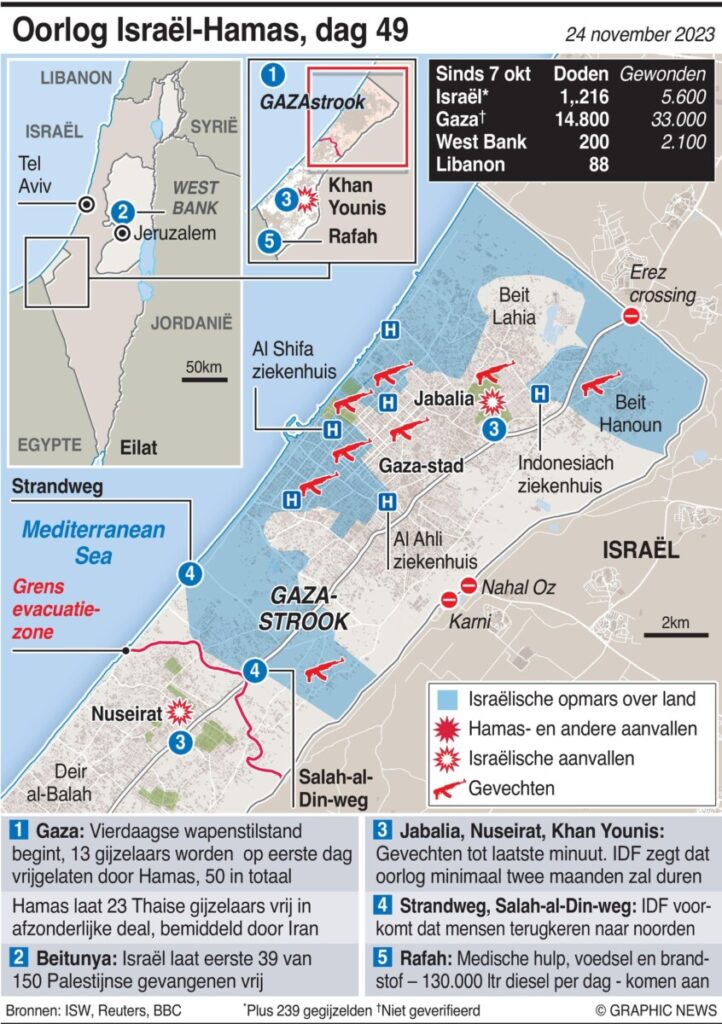 De aanvallen van IsraĆ«l begonnen nadat Hamas de grens overstak op 7 oktober en 1.200 IsraĆ«li’s doodde, met daarnaast meer dan 240 gegijzelden.