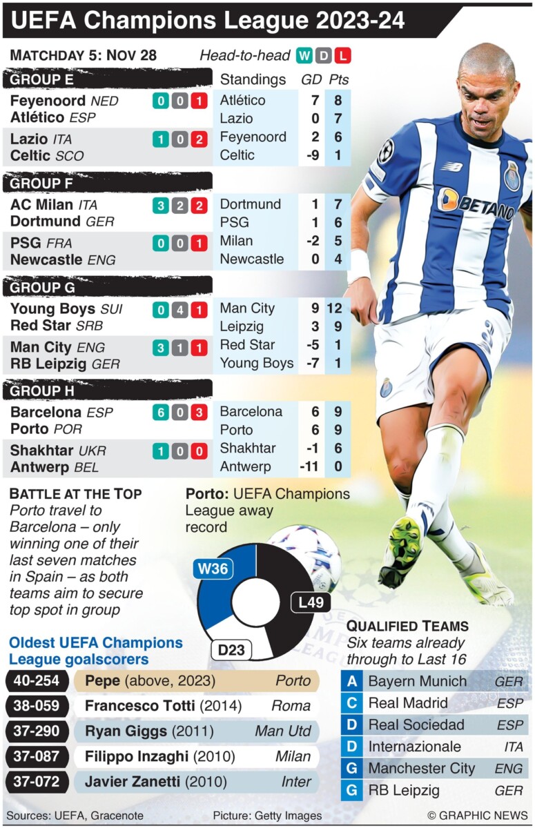 28 november 2023 – Europa’s nieuwe UEFA Champions League gaat verder, met belangrijke wedstrijden waaronder Porto, waarbij voormalig aanvoerder van Real Madrid Pepe terugkeert naar Spanje als de oudste doelpuntenmaker ooit in de competitie, tegenover Barcelona, Red Bull Leipzig op reis naar Manchester City en Newcastle United tegen Paris St. Germain. Zes teams hebben zich al geplaatst voor de knock-outfase, die in februari begint.