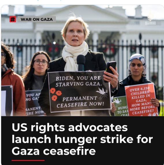 Acteur Cynthia Nixon sluit zich aan bij staatswetgevers en aanhangers van de Palestijnse rechten in een vijfdaagse hongerstaking buiten het Witte Huis, waarbij zij aandringt op een staakt-het-vuren in Gaza Geplaatst op november 28, 2023november 28, 2023 Bericht navigatie VorigeChina loopt voorop op het gebied van de opwekking van zonne-energieVolgendeDit Israël heeft geen toekomst in het Midden-Oosten