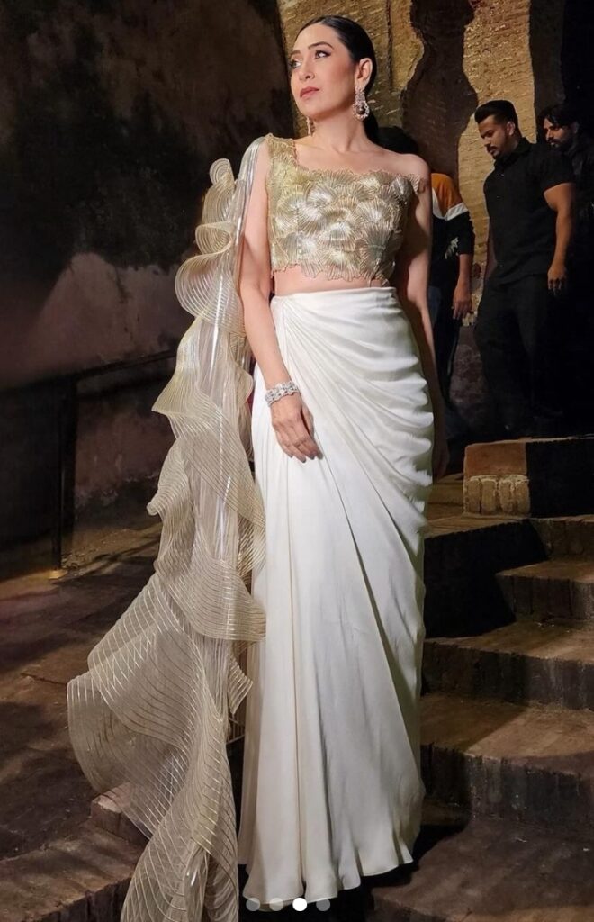 Bij de creatie van Amit Aggarwal stond deze keer een genuanceerde structuur centraal. Karisma Kapoor droeg een voorgedrapeerde zijden rok gecombineerd met een geborduurde polymeer top met koord en schelpachtige ontwerpen. Het vloerlange gordijn, gekenmerkt door de kenmerkende swill van Aggarwal, voegde een onderscheidend tintje toe en riep een charme op die doet denken aan de traditionele elegantie van een sari.