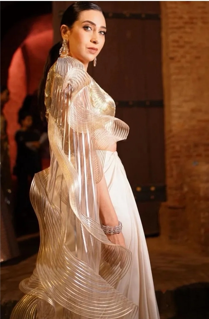 Bij de creatie van Amit Aggarwal stond deze keer een genuanceerde structuur centraal. Karisma Kapoor droeg een voorgedrapeerde zijden rok gecombineerd met een geborduurde polymeer top met koord en schelpachtige ontwerpen. Het vloerlange gordijn, gekenmerkt door de kenmerkende swill van Aggarwal, voegde een onderscheidend tintje toe en riep een charme op die doet denken aan de traditionele elegantie van een sari.