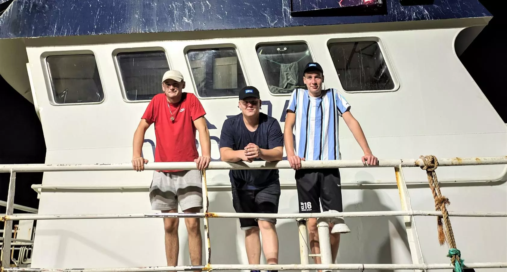 Drie jonge Nederlandse vissers in opleiding lopen stage op Surinaamse vissersboot