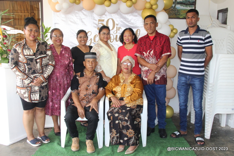 Dankbaar voor deze dag heeft het echtpaar Sarmo-Redjosentiko hun gouden huwelijksjubileum te midden van hun kinderen, families en vrienden gevierd. Bij dit heugelijk feit hebben namens districtscommissaris Mohamed Shafiek Goelaman, districtssecretaris Stephen Dompig, adjunct districtssecretaris Revenna Sanches en andere collega’s de felicitaties overgebracht aan het echtpaar, waarbij zij de gebruikelijke enveloppe met inhoud, een fotolijst en een bloemstuk in ontvangst mocht nemen.