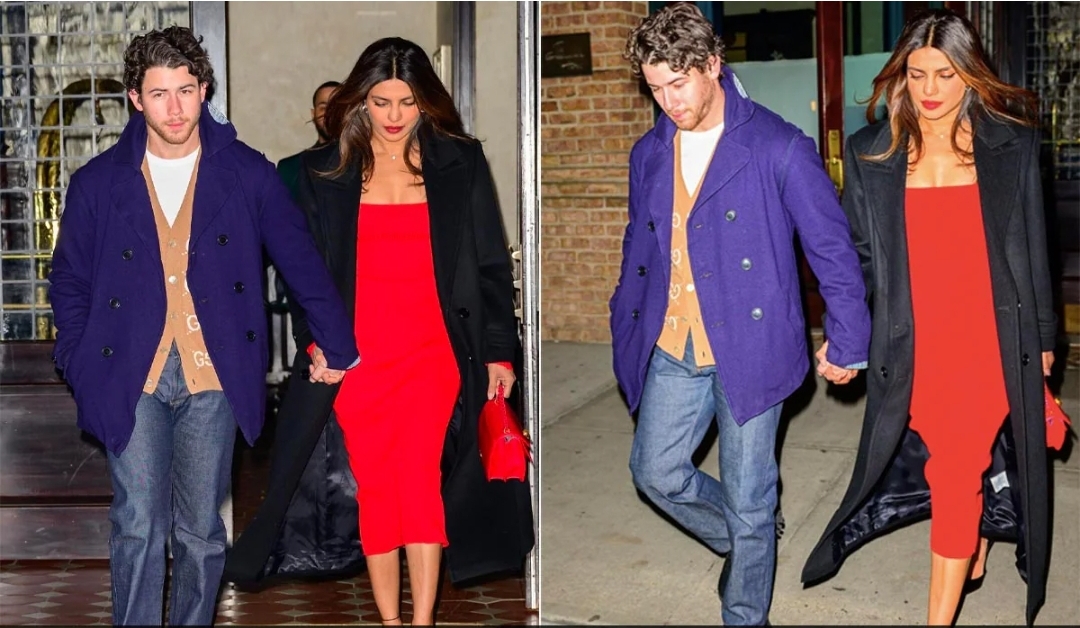 Op hun vijfde jubileum gingen Priyanka en Nick op een dinerdate in New York en zagen er op hun best uit. Nick droeg een wit T-shirt met mosterddetails en een koningsblauwe jas met lange mouwen en knopen aan de voorkant, en combineerde dit met een blauwe denim.