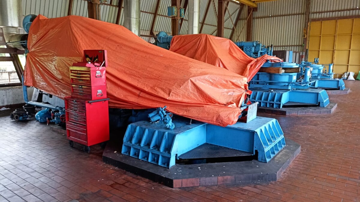(Fototekst: Twee van de vier geïnstalleerde waterpompen bij het pompgemaal Wakay draaien sinds enkele weken dag en nacht om water te pompen naar de Nickeriaanse rijstpolders voor de inzaai. Omdat de wateraanvoer ontoereikend blijft, zal nu getracht een van de twee defecte pompen te repareren en aan de praat te krijgen.)