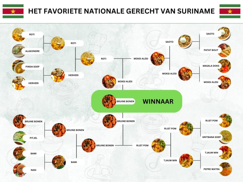 De bruine bonen won de online competitie “Favoriete Surinaamse Nationale Gerecht” met 64 procent van de 13.137 stemmen. Na een hele spannende competitie samen met vijftien andere gerechten is donderdagmiddag de Surinaamse bruine bonen met rijst, gekozen als het meest favoriete nationale gerecht onder Surinamers.