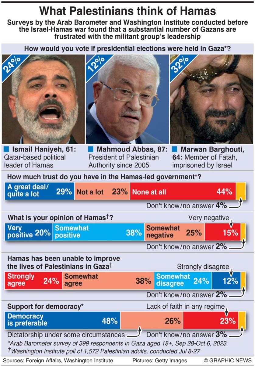 December 13, 2023 – Uit onderzoeken van de Arab Barometer en het Washington Institute, uitgevoerd vóór de oorlog tussen Israël en Hamas, blijkt dat een aanzienlijk aantal inwoners van Gaza gefrustreerd is over het leiderschap van de militante groep.