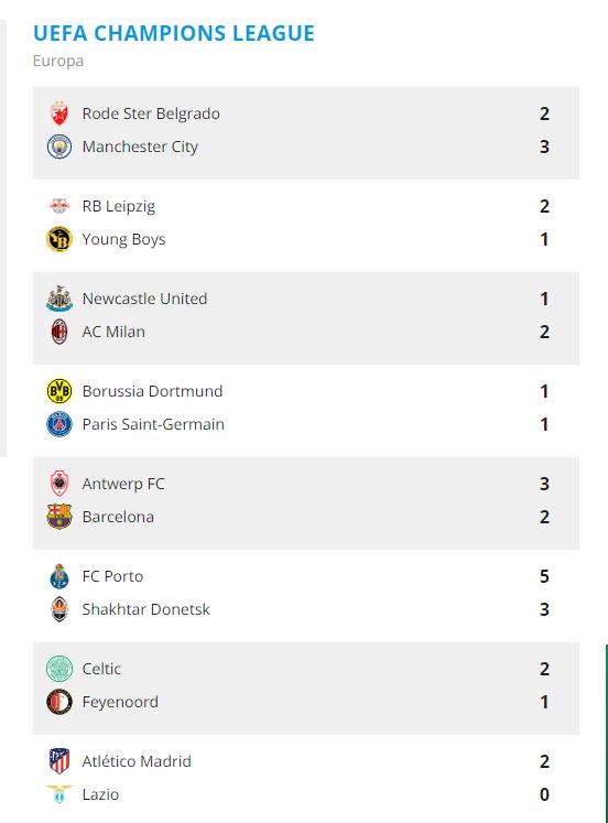 Paris Saint-Germain is door naar de knock-outfase van de UEFA Champions League ondanks een moeilijk parcours in de “groep des doods”. Ze speelden 1-1 gelijk tegen Borussia Dortmund en veroverden zo de tweede plek in de groep achter Dortmund, die de groep won. AC Milan werd uitgeschakeld uit de Champions League na een 2-1 overwinning op Newcastle United, omdat ze slechter scoorden op doelsaldo dan PSG. Milan gaat door naar de Europa League, terwijl Newcastle is uitgeschakeld uit Europees voetbal. De beslissende doelpunten voor PSG en Milan werden gescoord door respectievelijk Warren Zaire-Emery en Samuel Chukwueze.
